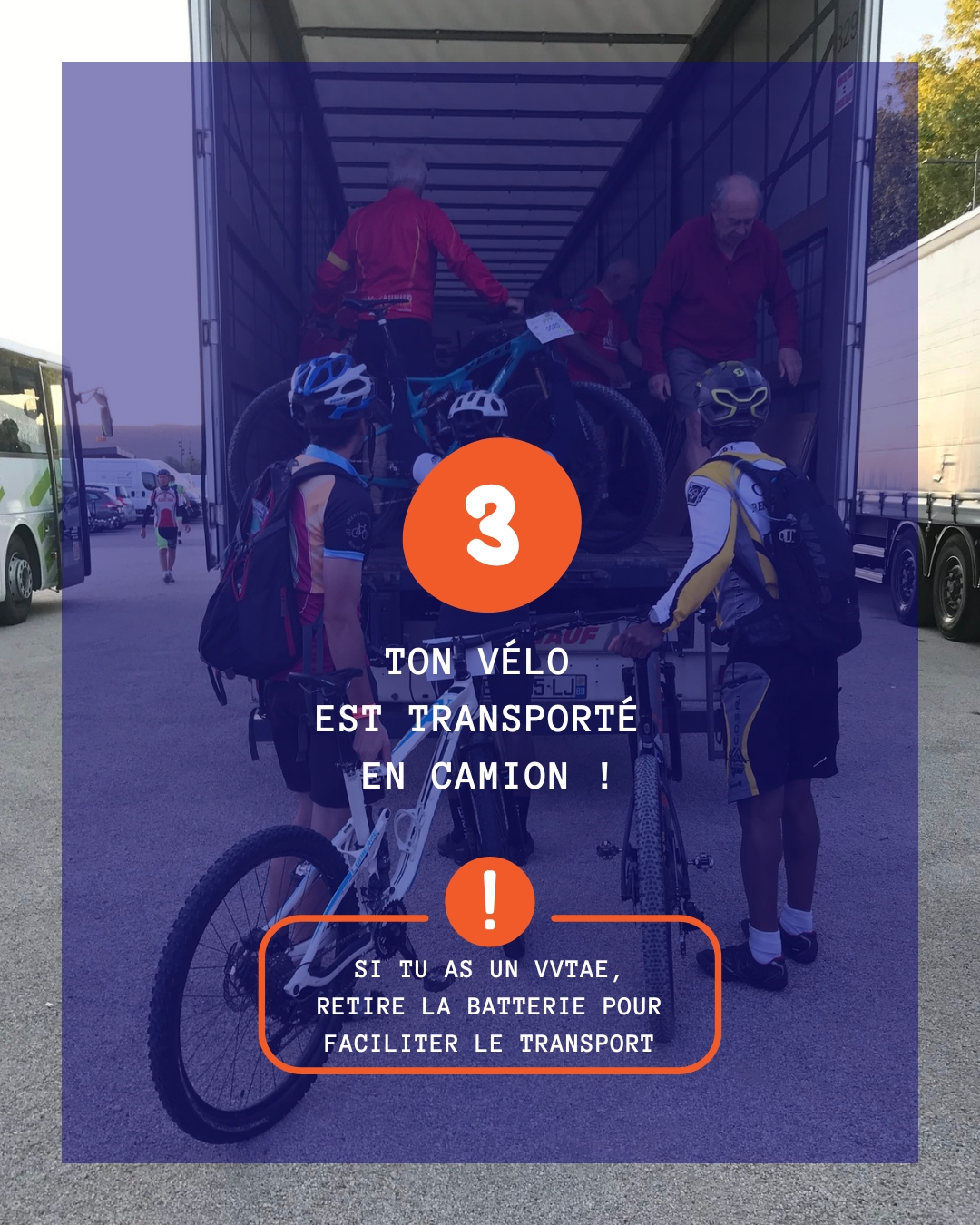 Oui, tu peux choisir l’option transport lors de ton inscription. Ton vélo sera acheminé au départ et toi tu montes en bus. Si tu as un VVTAE, le retrait de la batterie est obligatoire pour faciliter le chargement dans les camions.